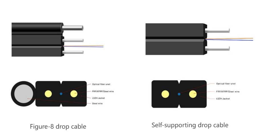 Flat, 1~2 core G.657A1/A2 bend-resistant fiber, parallel reinforcements (FRP or steel wire) on both sides, easy to lay on indoor and outdoor walls and pass through pipes. It is the mainstream optical cable for fiber to home.